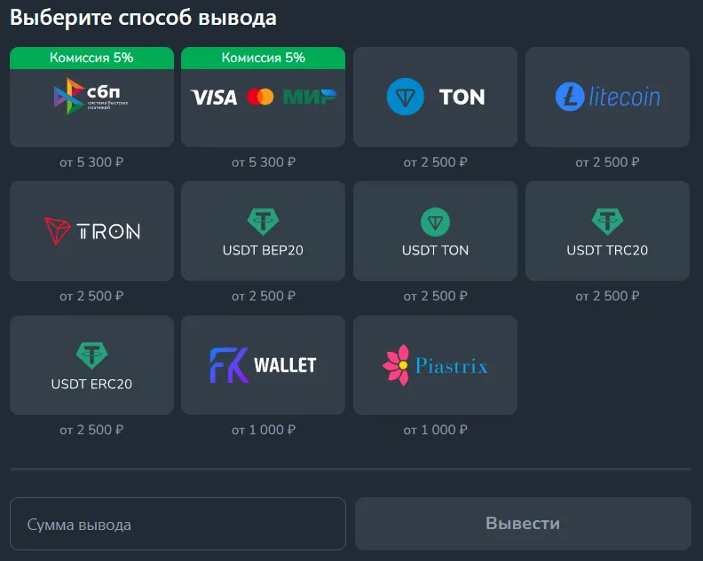 | Криптовалюта | 150₽ | 1-5 минут | до 2 часов |